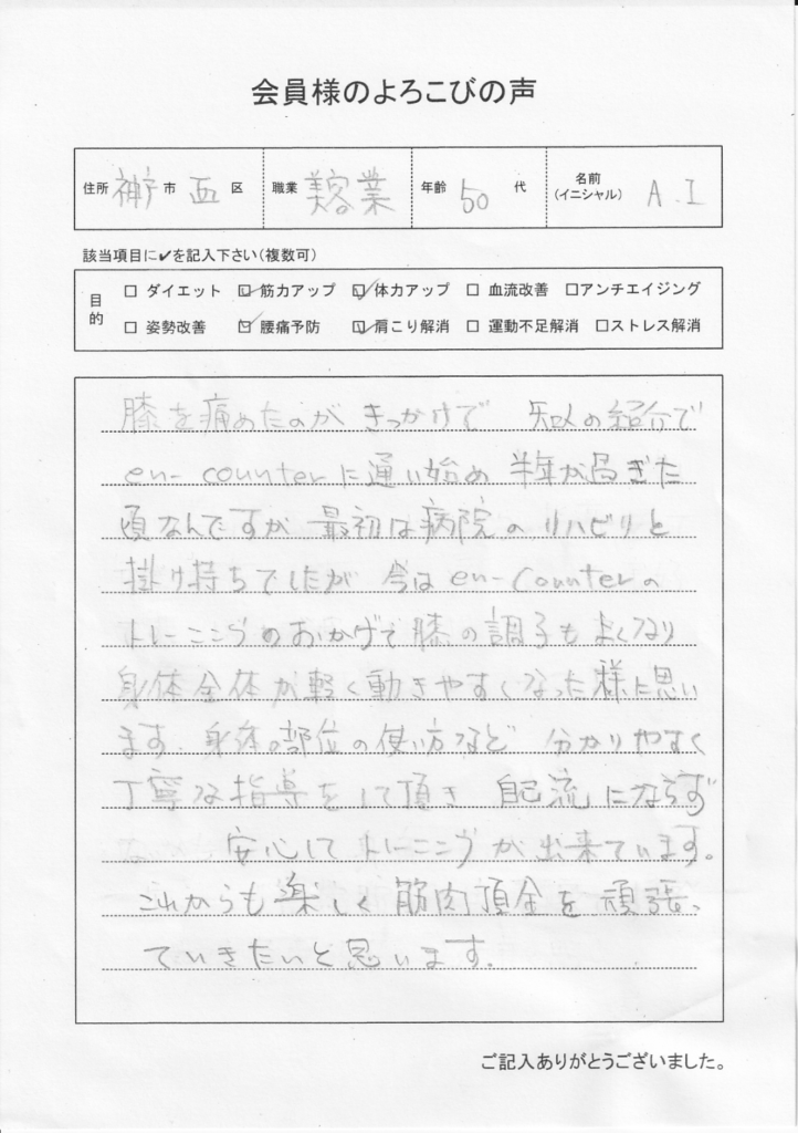 膝を痛めたのがきっかけで、知人の紹介でen-counterに通い始め、半年が過ぎた頃なんですが、最初は病院のリハビリと掛け持ちでしたが、今はen-counterのトレーニングのおかげで膝の調子も良くなり、身体全体が軽く動きやすくなった様に思います。