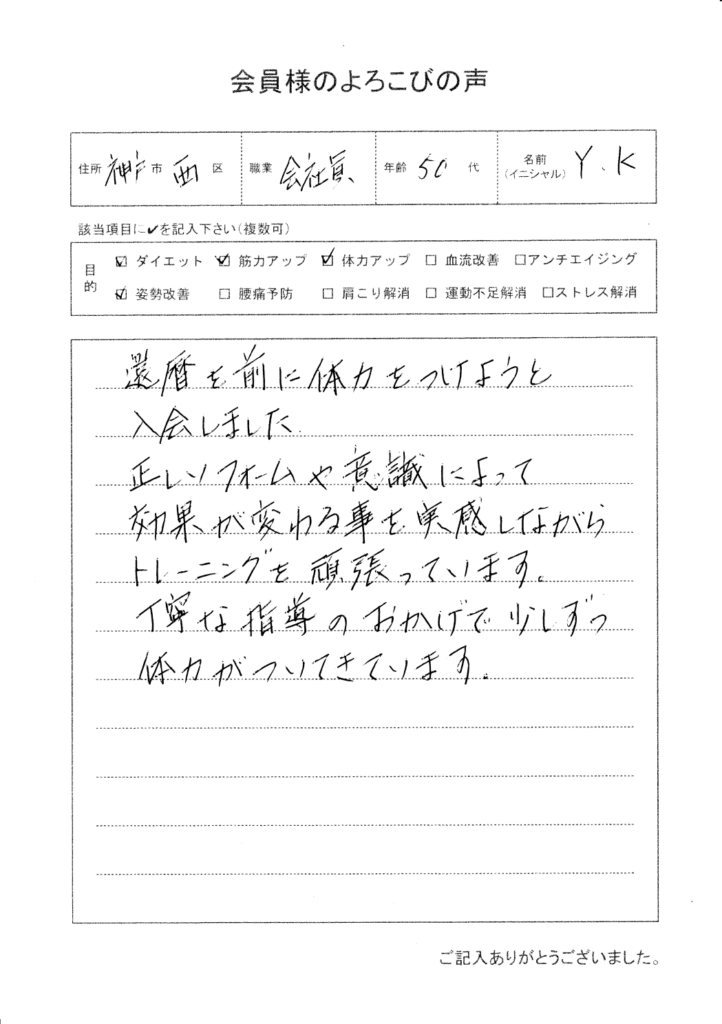 en-counter会員 Y.K様 2025年9月18日 最終更新日時 : 2025年9月18日 sasakura 還暦を前に体力をつけようと入会しました。正しいフォームや意識によって効果が変わる事を実感しながらトレーニングを頑張っています。丁寧な指導のおかげで少しずつ体力がついてきています。